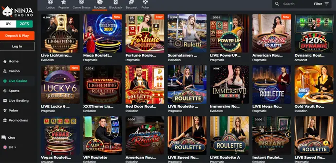 Interface of the Live Casino section of Ninja Casino (NetEnt)