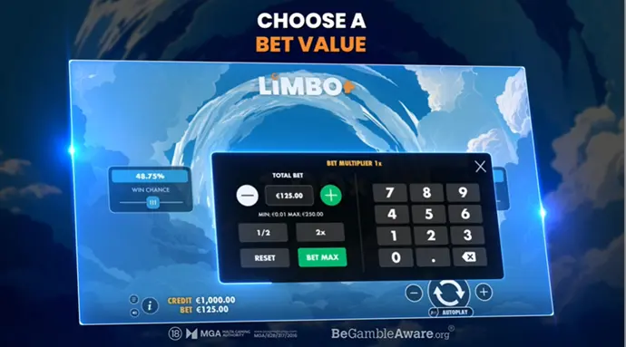 The total bet in Limbo+ ranges from €0.01 to €250. This range allows the game to suit a variety of player profiles.