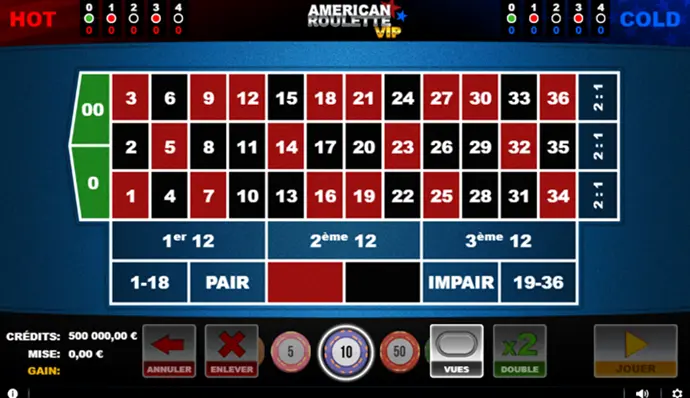 The interface focuses on readability without giving up a few useful visual markers. At the top, the “hot” and “cold” areas add a statistical touch that may appeal to readers who like to keep an eye on the numbers showing up most often or staying unusually quiet. At the bottom, the clearly visible chips, the undo and clear buttons, and the sharply separated “play” button make everything easy to handle. This VIP American roulette by Gaming1 gives off the impression of a solid, clean table with no unnecessary detours, almost built for players who want to launch a game without losing time in bloated menus.